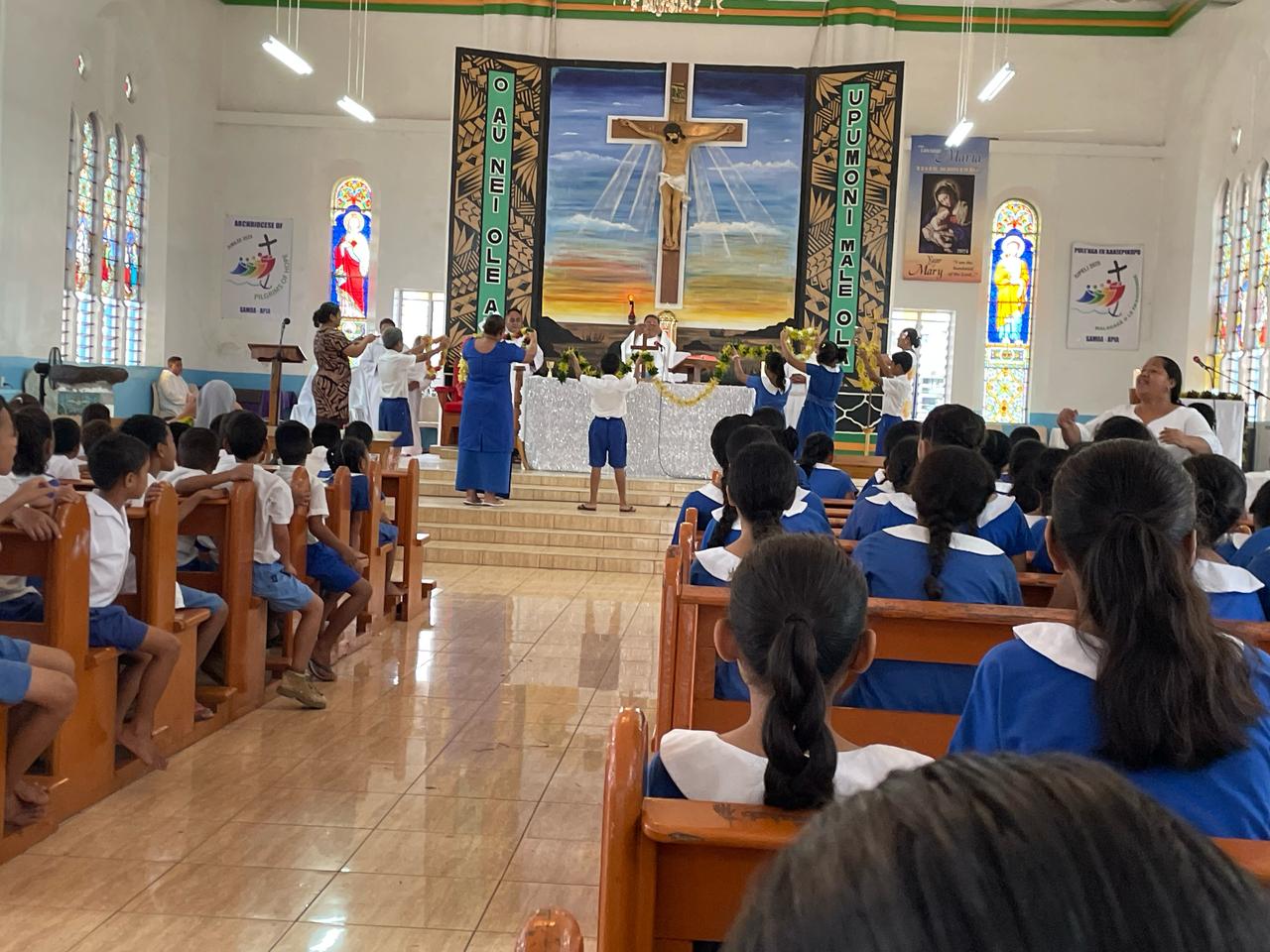 Prav lep pozdrav iz naše šole Sv. Jožefa v Leauva’a in naše šole Božjega Usmiljenja v Malololelei. Naše šolsko leto se je začelo februarja in zdaj, ko vam pišemo, končujemo 12. teden prvega šolskega polletja. Za velikonočne praznike bodo imeli učenci en teden šolskih počitnic.