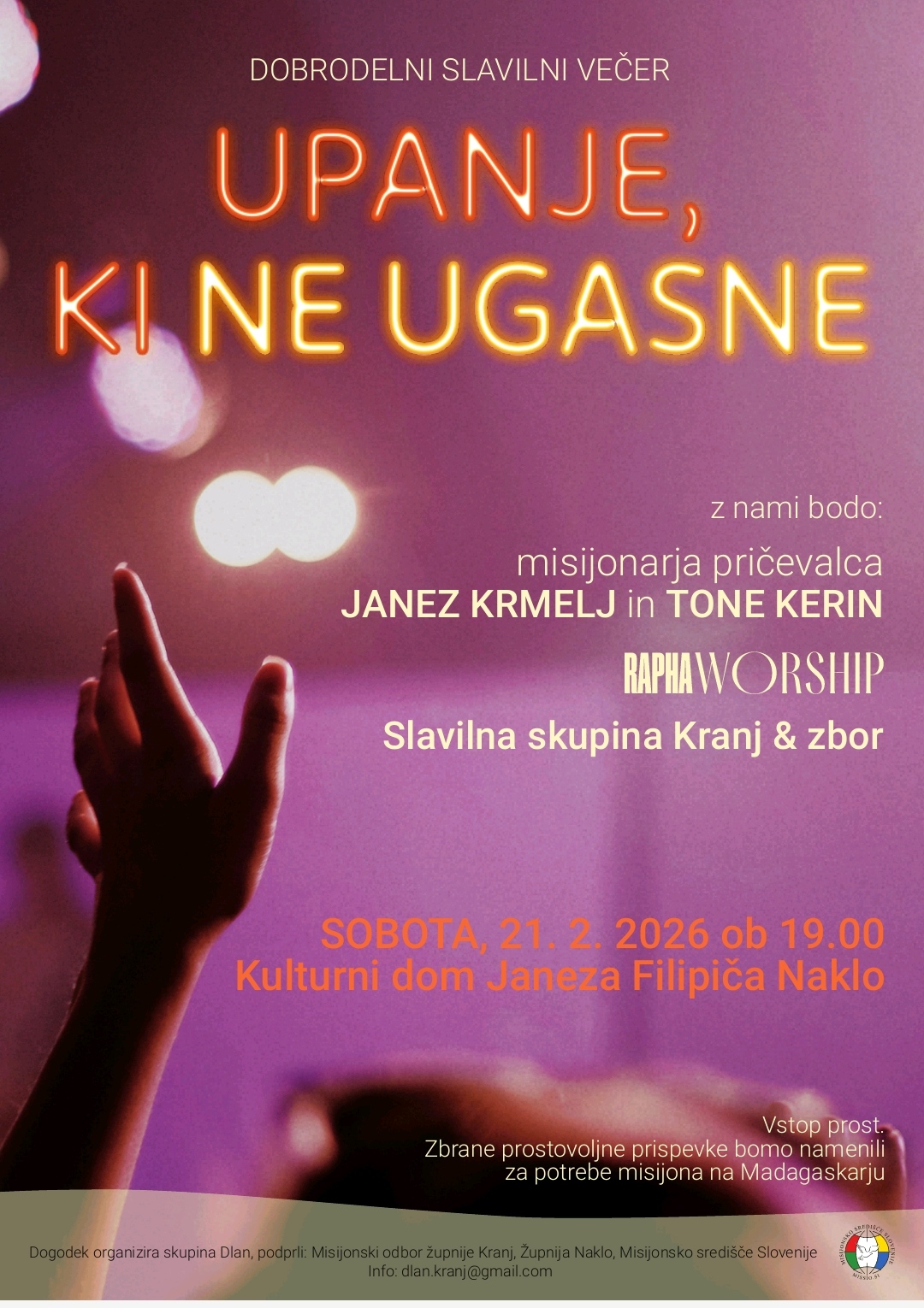 V župniji Kranj bodo tudi letos gostili misijonarja Janeza Krmelja. Skupina Dlan tokrat pripravlja nekoliko drugačen dogodek. V dvorani v Naklem bo 21. februarja ob 19. uri dobrodelni slavilni večer z gosti. Kot pričevalca bosta prisotna misijonarja Janez Krmelj in Tone Kerin. Za glasbo in slavljenje pa bodo poskrbeli Slavilna skupina Kranj in skupina Rapha worship. Sodeloval bo tudi projektni zbor.